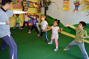 Kung Fu carries enormous benefits to growing little children. Among the top reasons we offer this activity as part of our unique curriculum is to help foster self-discipline, boost socialization skills, encourage physical activity, learn to set and achieve goals, increase self-esteem and sense of respect, encourage non-violent conflict resolution and improve listening skills.